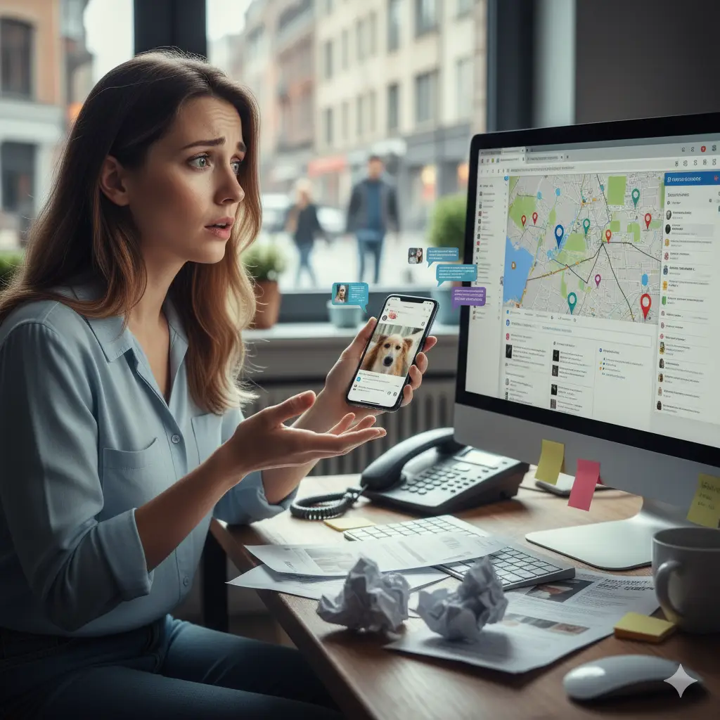 Insight: Current search efforts are fragmented and inefficient, relying on disorganized social media posts, scattered paper flyers, and chaotic group chats. The user struggles to manage multiple communication channels while simultaneously trying to search.
